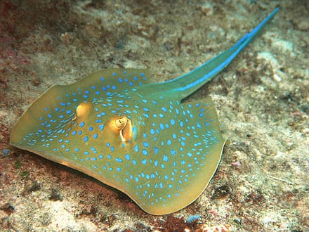 En ocasiones, sin embargo, se pueden ver algunos de los animales marinos más grandes, como las rayas panal, las rayas leopardo y las rayas cola de milano, escondidas en las regiones exteriores arenosas.