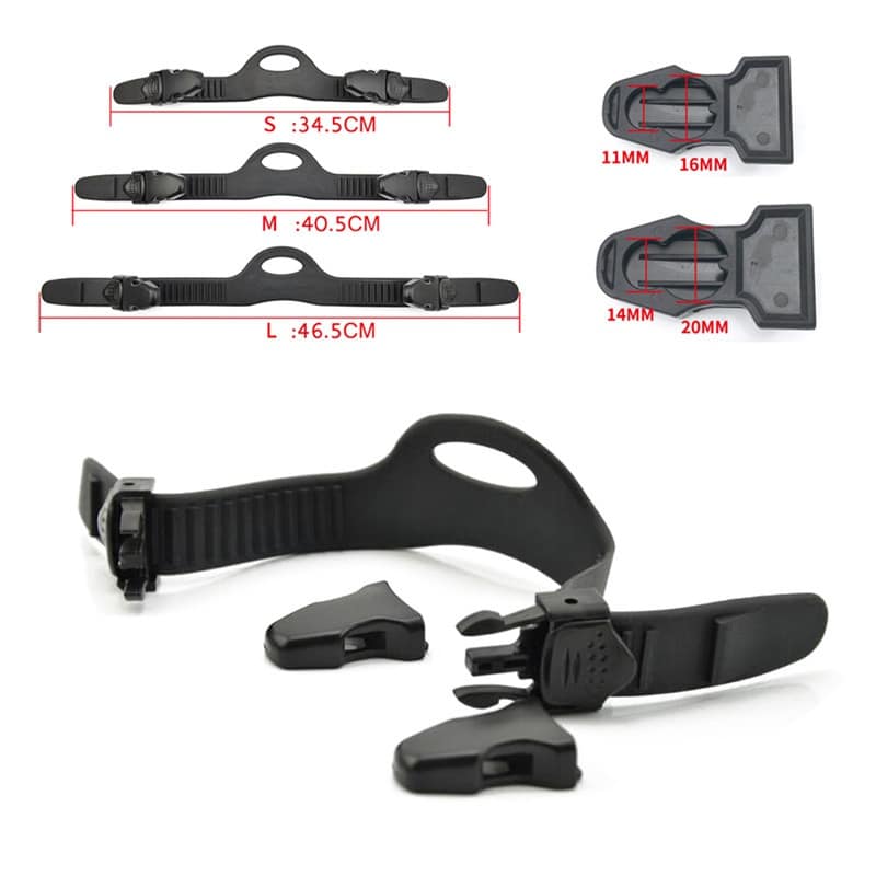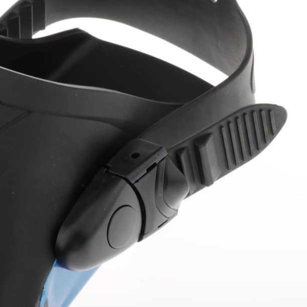 - Vuelva a Conectar la Correa (si aplica): Las hebillas de liberación rápida facilitan el retiro de las aletas tras sumergirse. Asegúrese de reconectar estas hebillas antes de ponerse las aletas. Asimismo, afloje las correas y oriente la hebillas hacia abajo para que no estorben.
