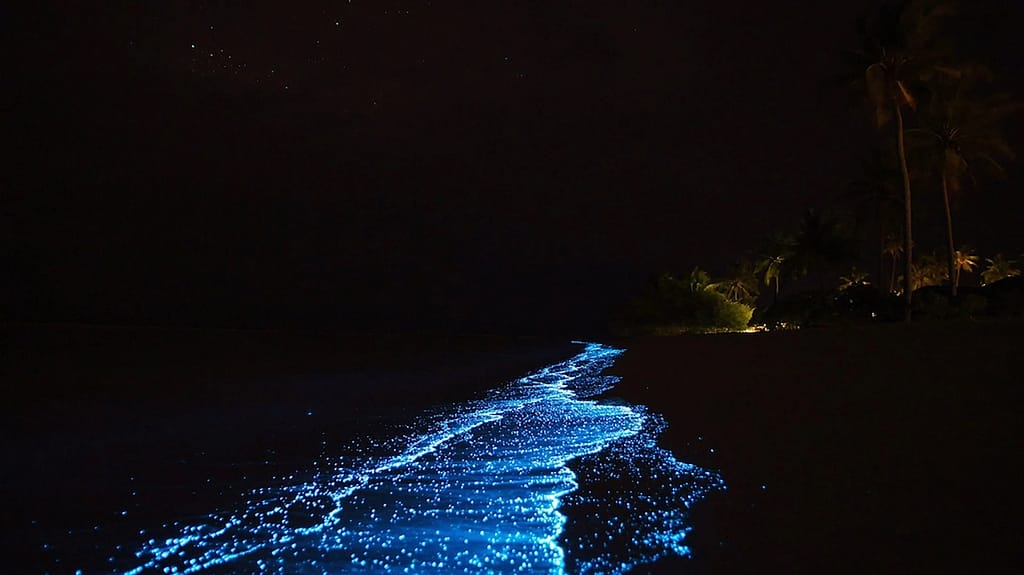 Las Maldivas son un paraÃso tanto en tierra como bajo el agua, especialmente fascinantes durante las inmersiones nocturnas. Este archipiélago es famoso por sus aguas cristalinas y vida marina diversa. Al caer la noche, los arrecifes se transforman en escenarios vibrantes donde la bioluminiscencia juega un papel principal. Los buceadores pueden observar cómo pequeños organismos iluminan las aguas, creando una atmósfera etérea.
